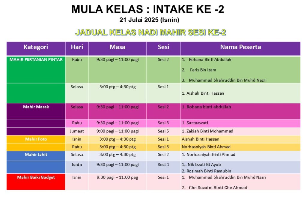 JADUAL KELAS MAHIR INTAKE 2 NADI KG KALAI