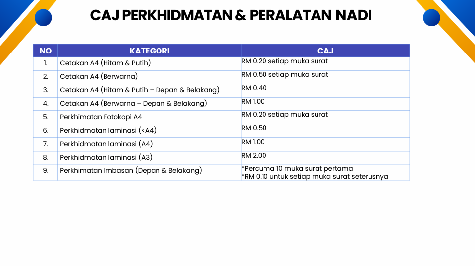 Berikut adalah caj pengunaan peralatan